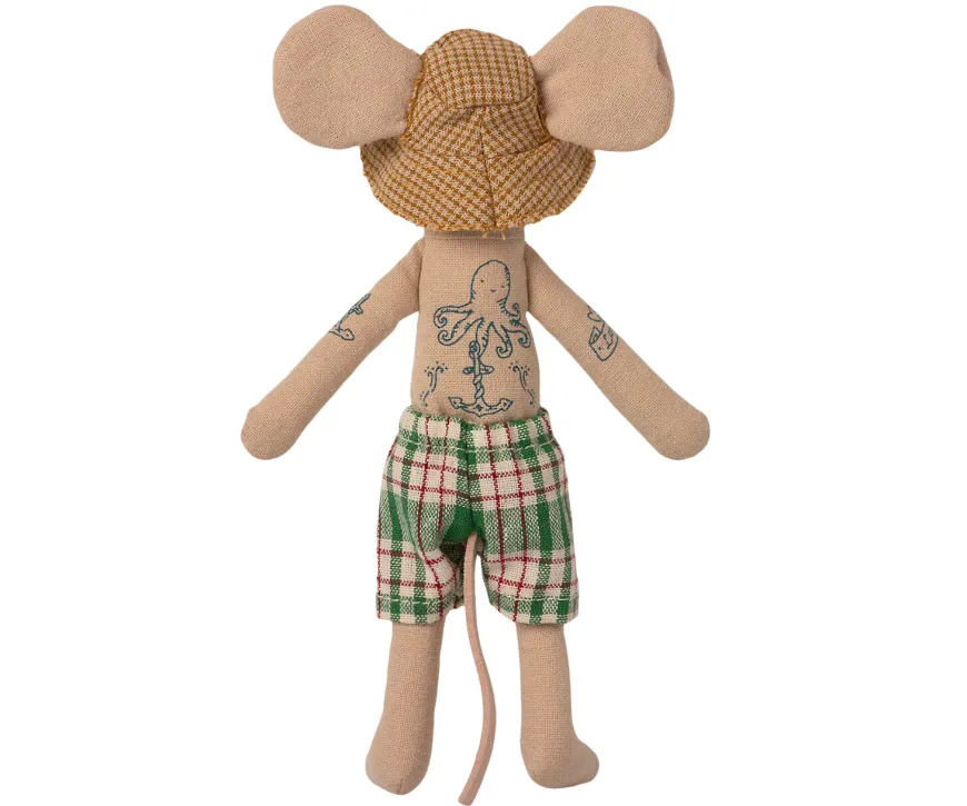 Vacation Time! Dad Mouse Is Ready For A Day At The Beach, With His Sun Hat, Swim Trunks, And A Beautiful Striped Beach House.