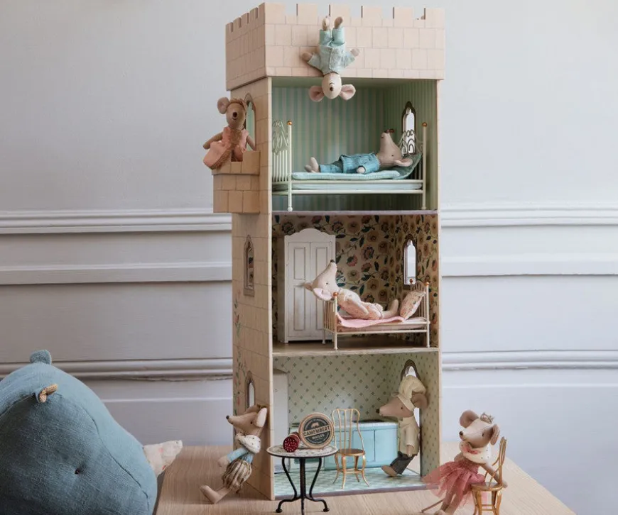 Introducing Our Gorgeous Mouse Castle With Kitchen! Made With Strong Cardboard And Designed With Special Maileg Prints, This Castle Is Perfect For Playtime. Explore The Ground Floor Kitchen And The Charming Balcony On The Third Floor. While It’s Designed For Big Brother And Sister Mice, The Little Ones Can Also Join In The Fun. Get Ready For Exciting Adventures And Let The Storytelling Unfold In This Incredible Castle! See Furniture To Add Here.