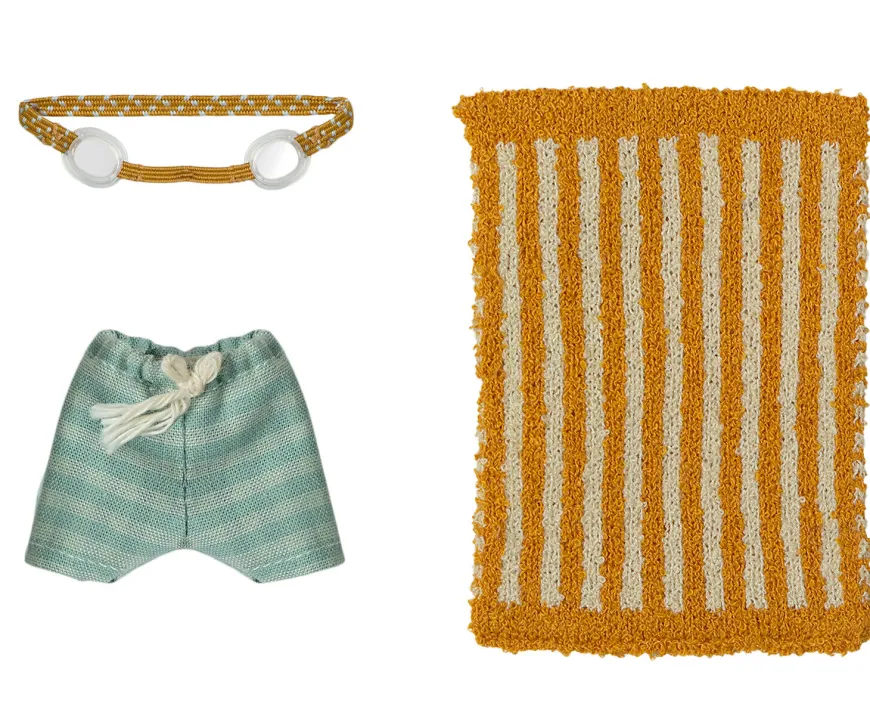 Vacation Time. This Set Includes All Essential Accessories For A Fun Day At The Beach: Trunks, Goggles, And A Towel. It All Fits The Mice In Size Big Brother/Sister Perfectly.
