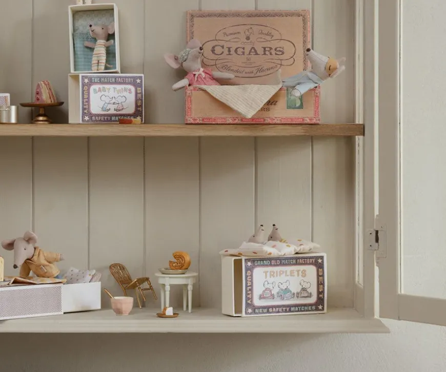 Surprise! It’s Triplets! Not Two, But Three Baby Mice In A Box! They Cozy Up Together In Their Box To Sleep And Keep Their Mummy On Her Toes During The Day. Dressed Cute & Complementary In Stripes, They Come Cuddled Together In Blanketed Pockets.